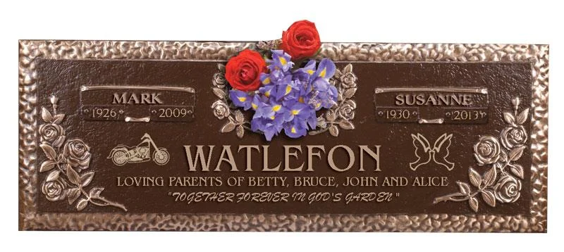 A bronze marker is placed flat on the ground. The bronze is most commonly engraved with a person’s full name, date of birth, and date of death. Most markers also have a unique frame on the outer edges, along with a personal notation or prayer. The bronze is attached to a granite base, and that base is placed into the ground. Bronze and granite bases come in a variety of colors and multiple fonts are available.